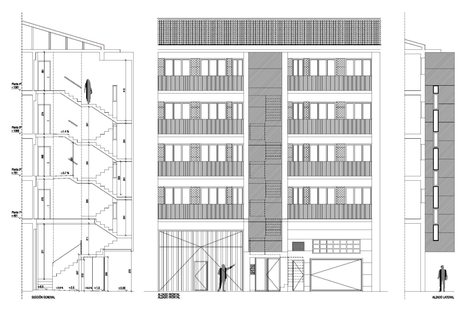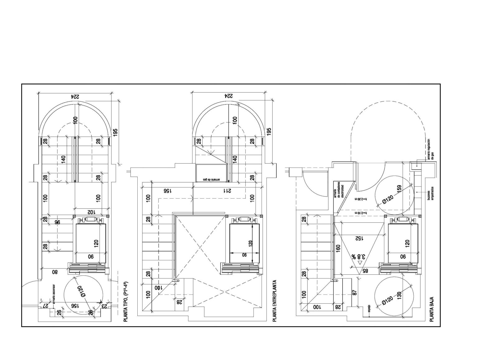 Sobre un portal sin ascensor, dio lugar a una nueva escalera emergente sobre fachada, acogiéndonos a estudio de detalle previo, para poder alojar sobre el interior del inmueble el ascensor que dota a las viviendas de acceso en cada planta.