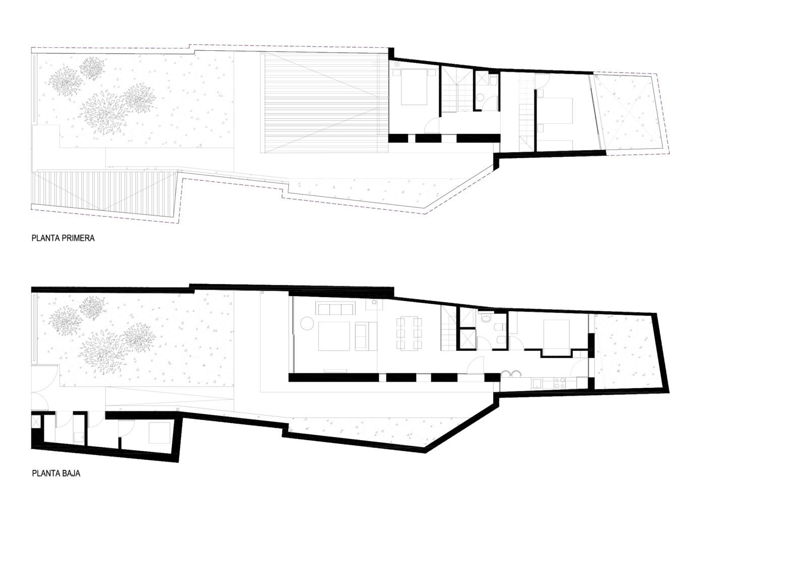 La distribución interior, una vez más, se ajusta a las necesidades del cliente, teniendo una planta baja diáfana con zona de estar a fachada principal y cocina a patio. Un pequeño aseo termina de alojarse en el acceso bajo la escalera de contrahuellas abiertas. Sobre planta primera se distribuyen un total de tres habitaciones y baño completo y otra escalera abierta conduce a una entreplanta como zona de usos múltiples.