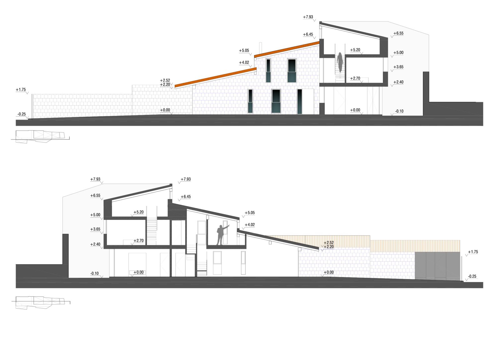 El lenguaje de la fachada principal de ventanas rasgadas que engarzan con los volúmenes adyacentes, dotan a esta edificación en pura consonancia con el paraje circundante. Sobre la fachada lateral se abre un juego de ventanas verticales que rasgan el muro de mampostería. La fachada anterior se reviste de mortero monocapa nutriéndose de luz sobre un patio interior.