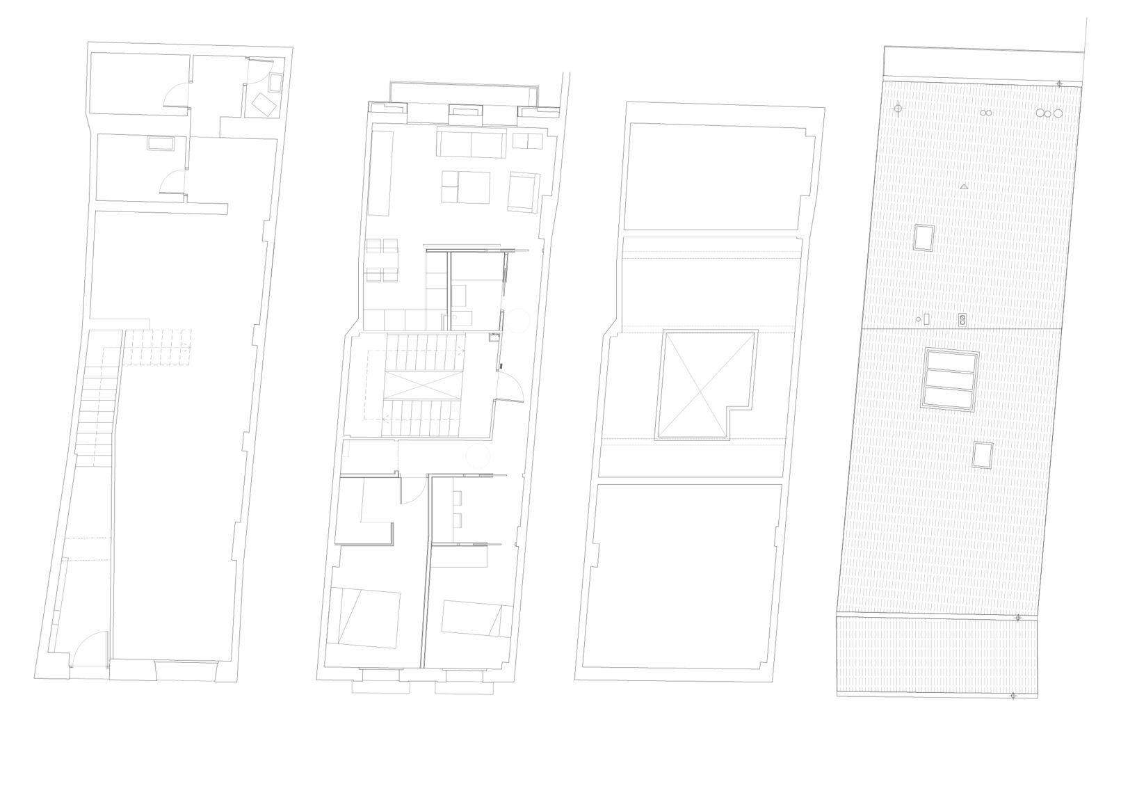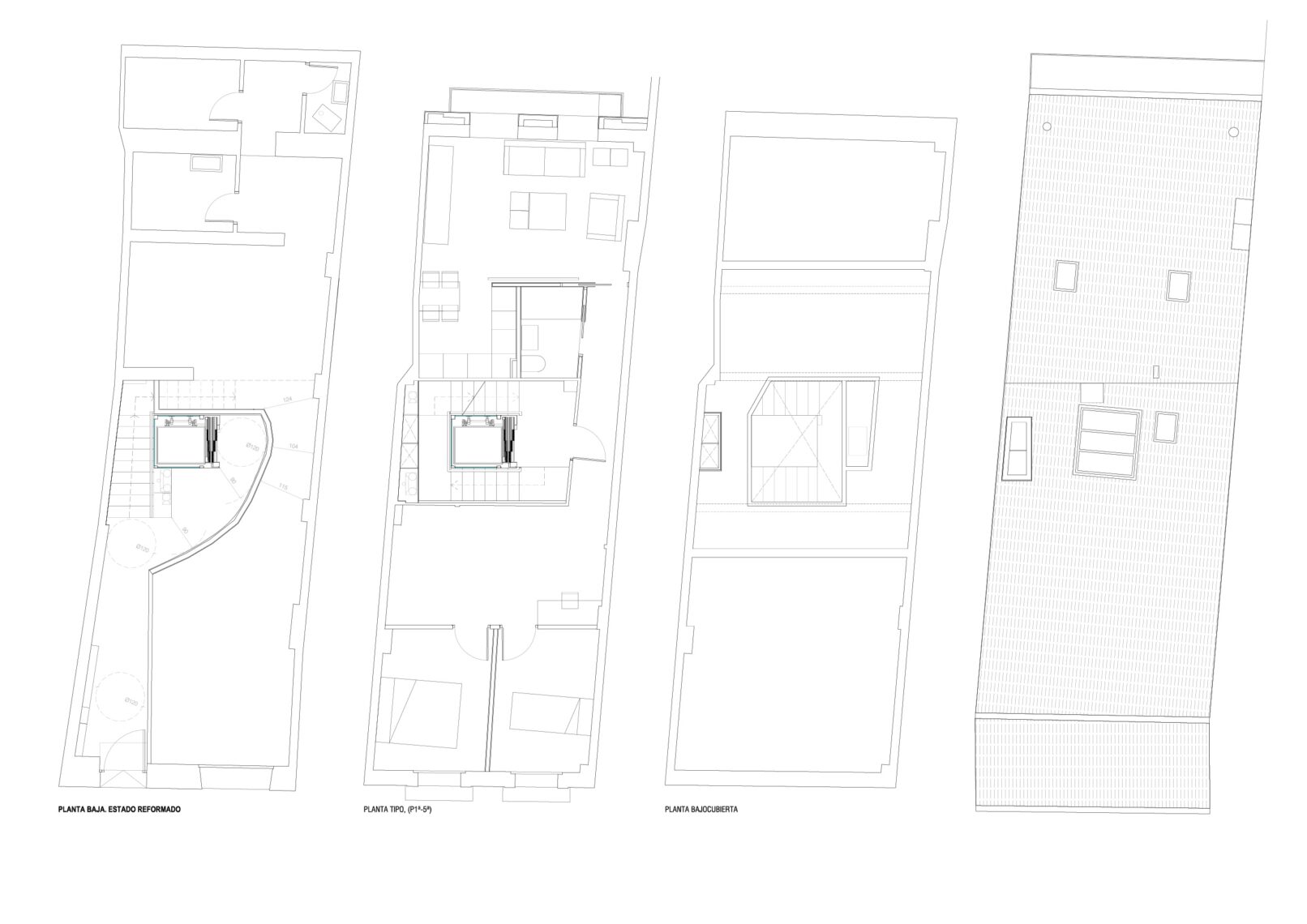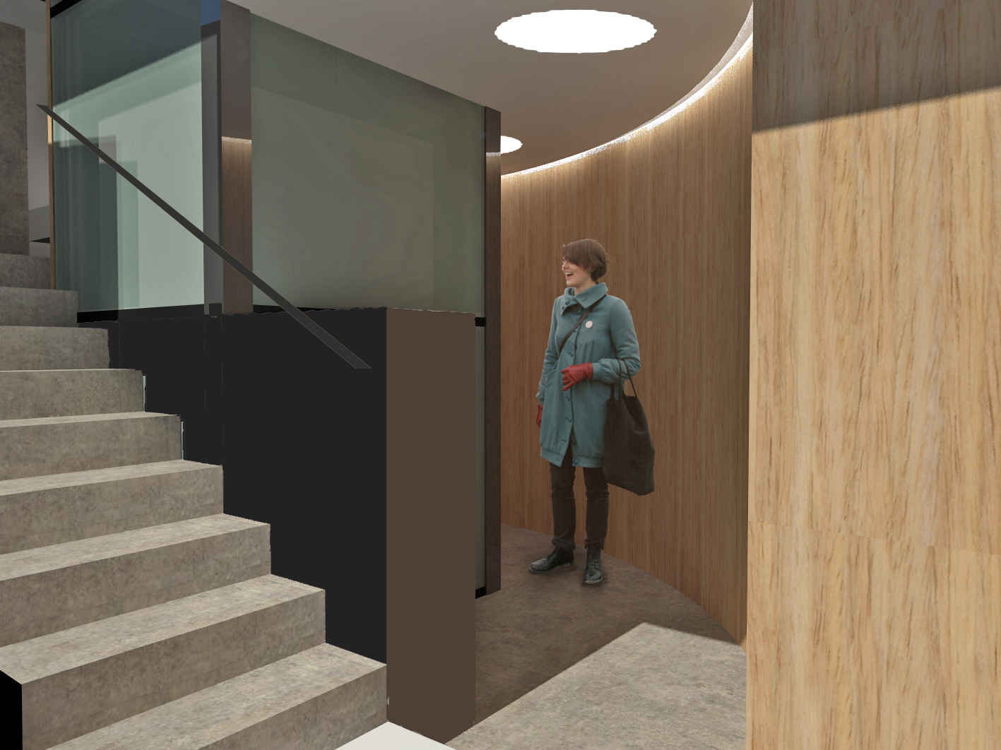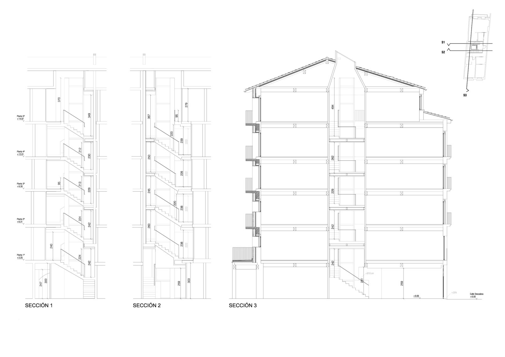 Instalación de ascensor sobre hueco de escaleras pre-existente. Se tuvieron que derribar los anteriores tramos de escaleras de plantas elevadas, prevaleciendo los rellanos de planta e intermedios. Escalera de una anchura ajustada a 80 cm para poder dar lugar a un ascensor de 90*120 cm y eliminar así completamente barreras. Se invadió parte del local de planta baja con una partición en curvatura para que el espacio de cesión fuera el mínimo posible.