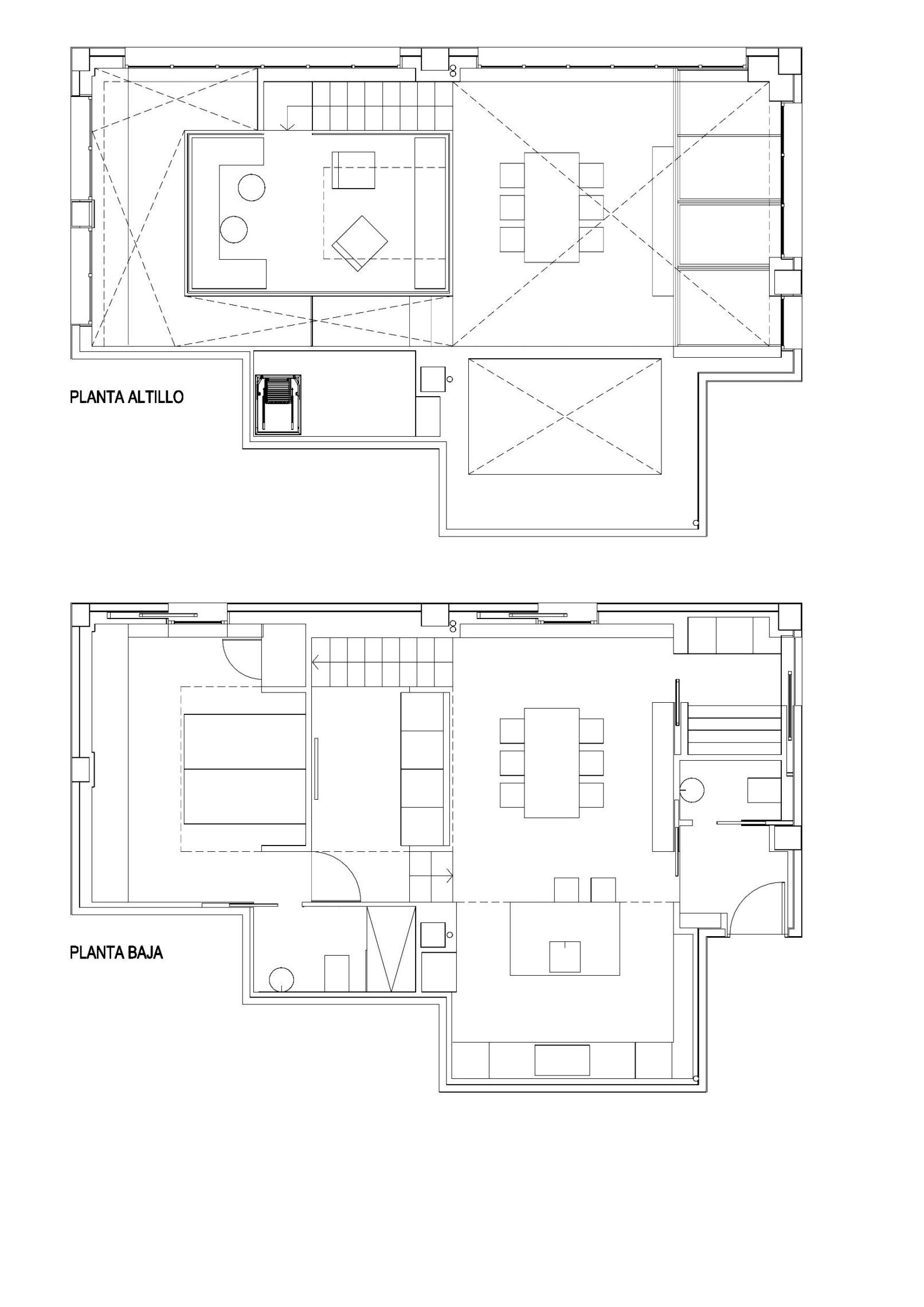 Se divide en dos zonas diferenciadas, una inferior donde se desarrolla todo el programa con vestíbulo de acceso, cuarto inodoro, tendedero cerrado, zona de día, (estar-comedor-cocina), y habitación principal con baño completo. Una zona elevada de altillo sobre-elevado que delimita la zona de estar y cama de dormitorio de planta baja y donde se vislumbra una visual general del espacio circundante. Esta zona se destina a oficina o similar.