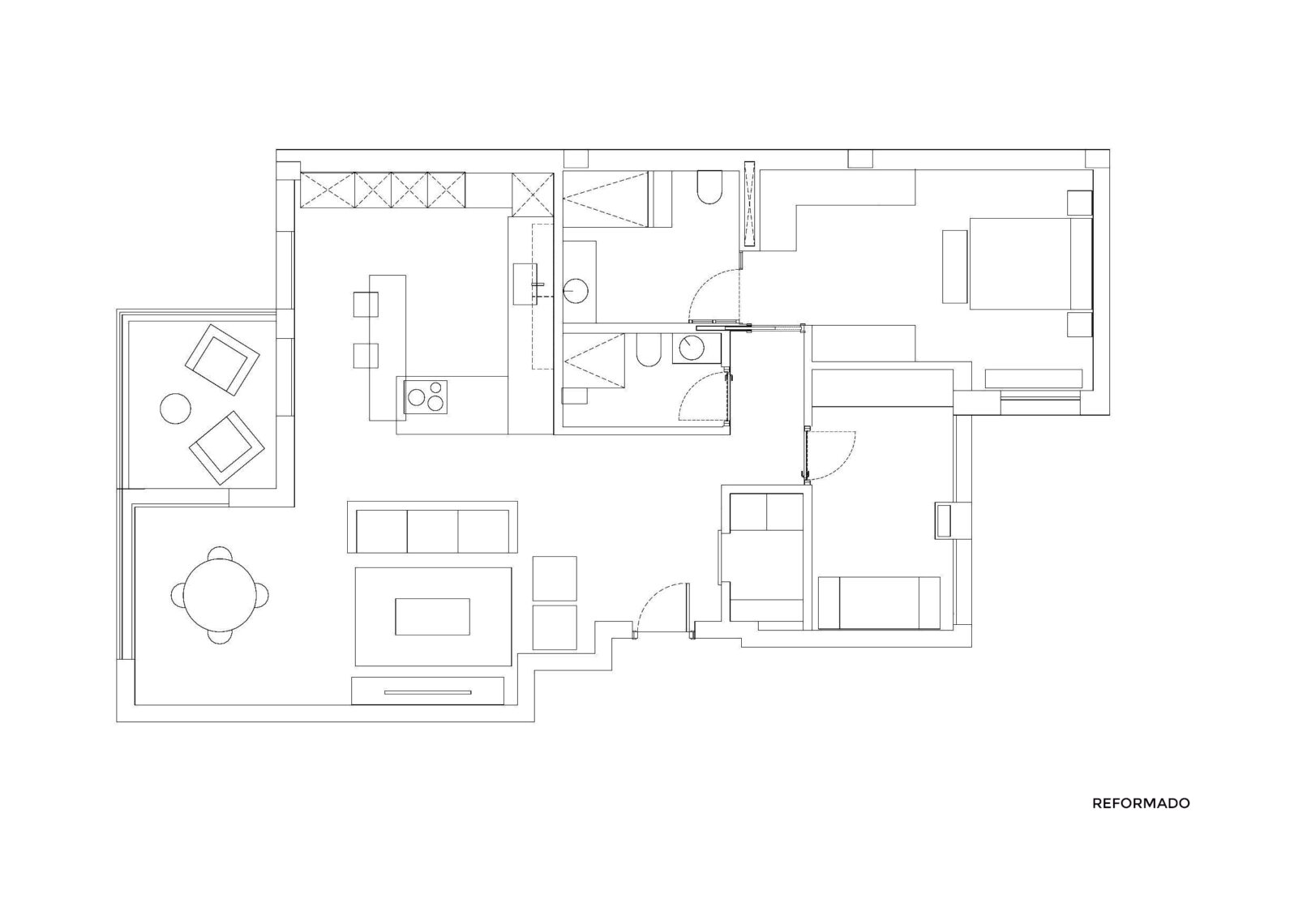 Reforma con distribución abierta en planta con una cocina previamente encargada por el cliente, amoldando el espacio para la cabida de ésta.